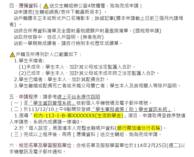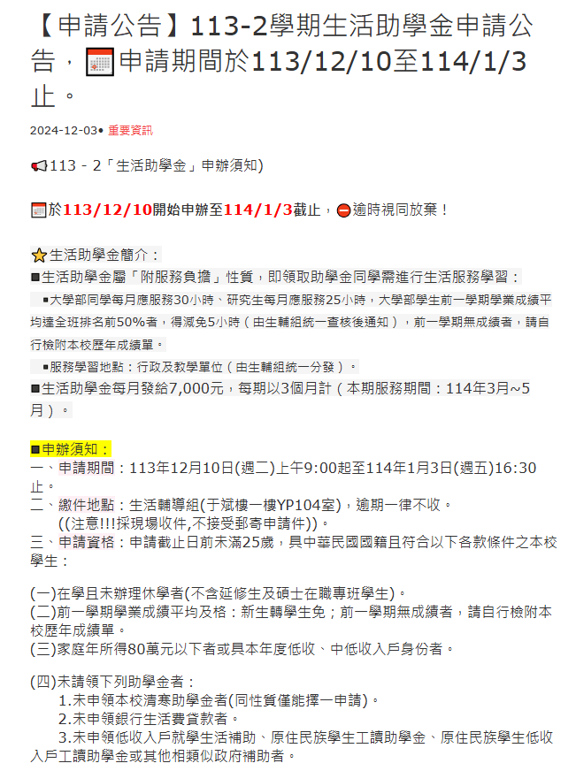 首頁 最新公告 獎助學金 113學年度第2學期生活助學金申請公告